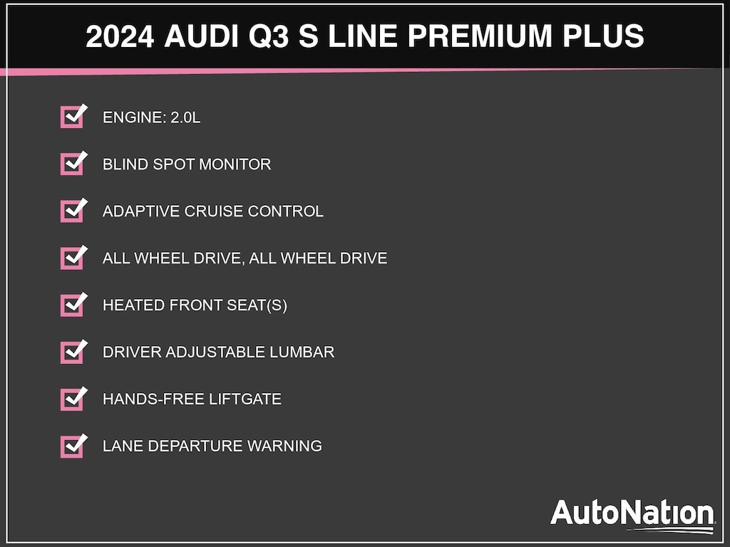 Check out this pre-owned 2024 Audi Q3 we recently got in. This Audi includes: AUDI BEAM-RINGS GLACIER WHITE METALLIC PREMIUM PLUS PACKAGE Keyless Start Mirror Memory Seat Memory Hands-Free Liftgate Auto-Dimming Rearview Mirror Back-Up Camera Aerial View Display System Heated Mirrors Security System Satellite Radio Power Door Locks Keyless Entry Power Folding Mirrors Requires Subscription Remote Trunk Release AUDI GUARD PROTECTION KIT PEARL BEIGE, LEATHER SEATING SURFACES Leather Seats *Note - For third party subscriptions or services, please contact the dealer for more information.* Off-road or on the street, this Audi Q3 S line Premium Plus handles with ease. No matter the varying terrain or weather conditions, this all-wheel drive vehicle will help you reach your destination safely and securely in a well-appointed cabin with many features found on cars twice the price. Marked by excellent quality and features with unmistakable refined leather interior that added value and class to the Audi Q3 S line Premium Plus.